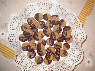 Mentre erano in forno ho fatto sciogliere il cioccolato (nel microonde), e quando i biscotti sono raffreddati li ho ricoperti per metà con il cioccolato.