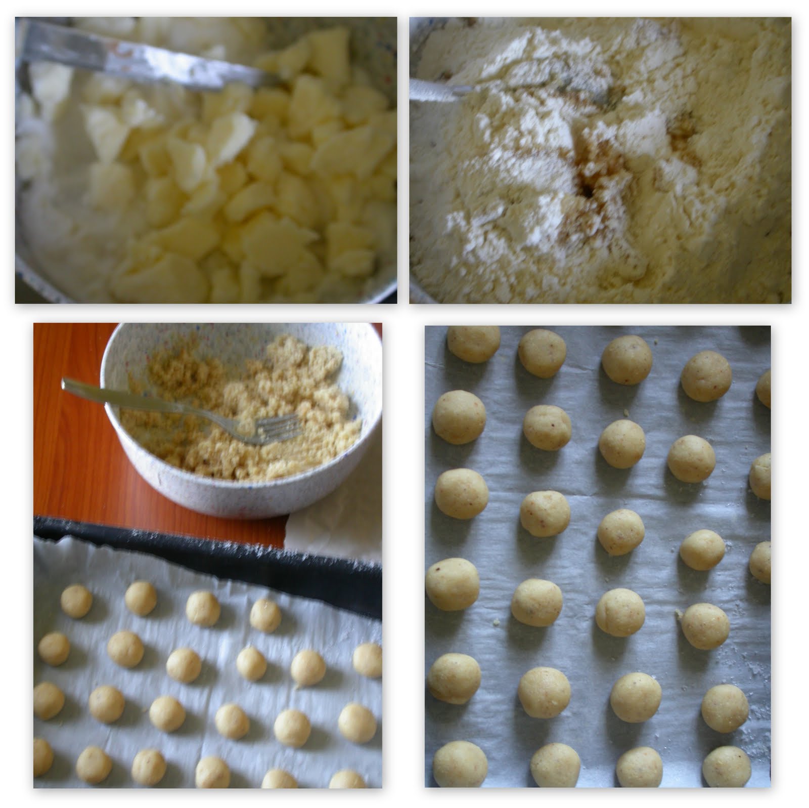 Ora si fanno delle palline grosse come nocciole...più piccole sono meglio verranno i baci (le mie sono un po' grosse), una volta sistemate sulla placca mettere tutto nel congelatore per 15 minuti e poi infornare in forno caldo a 150° per 15 minuti, non devono diventare scure.