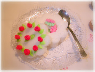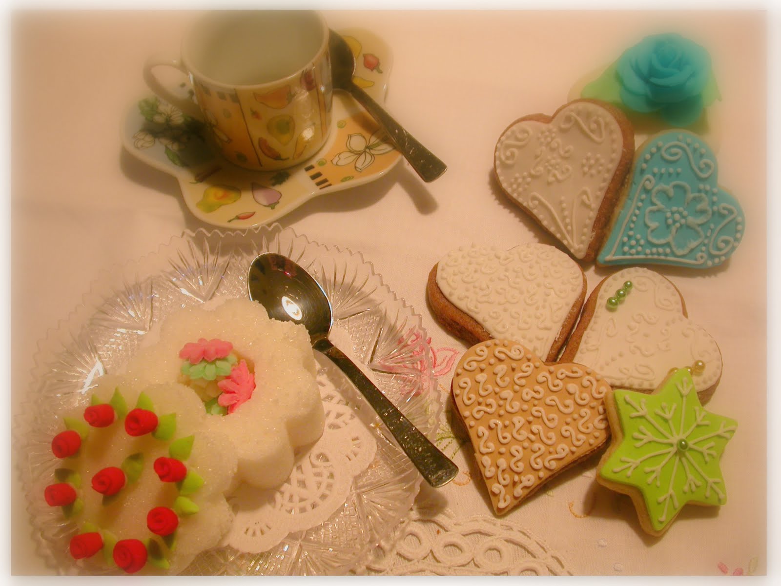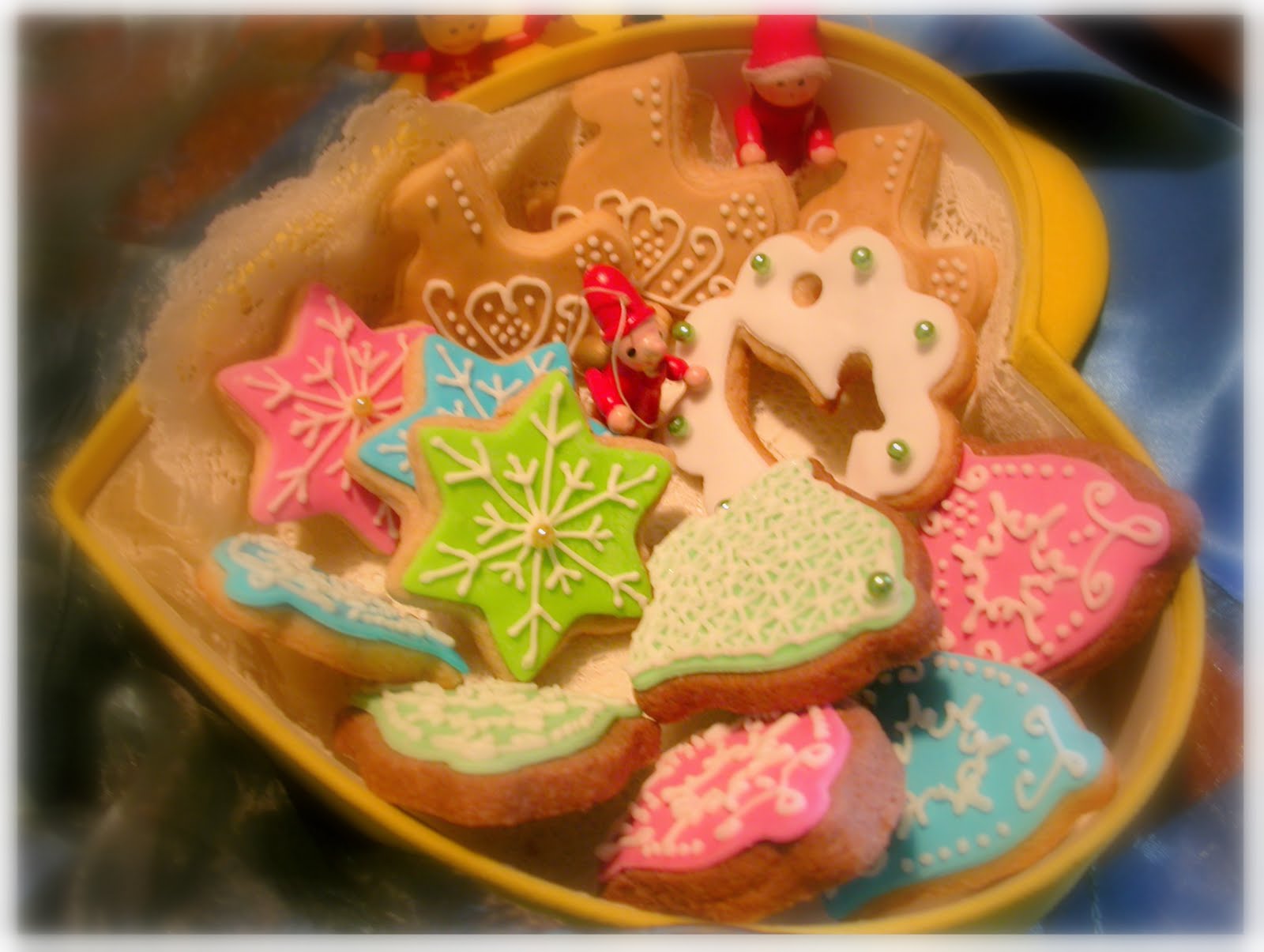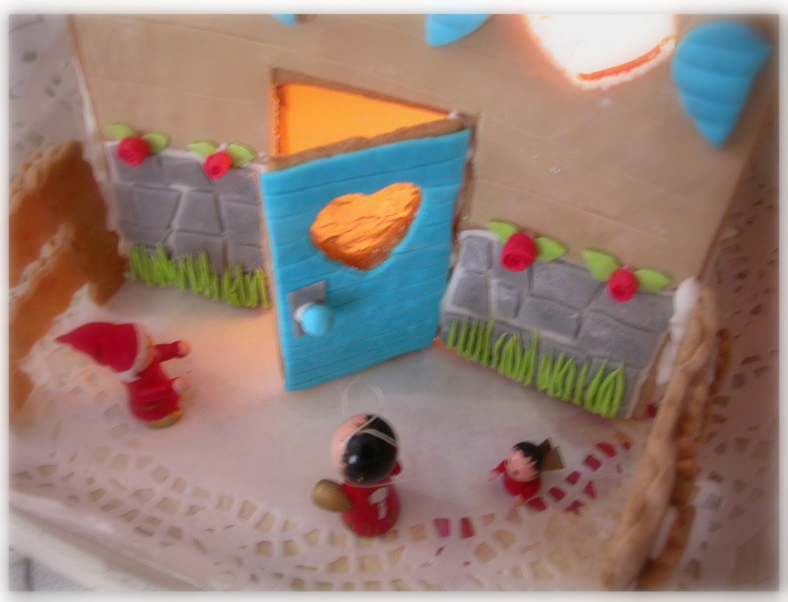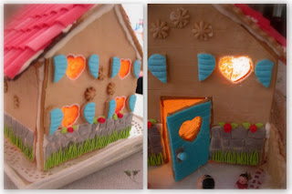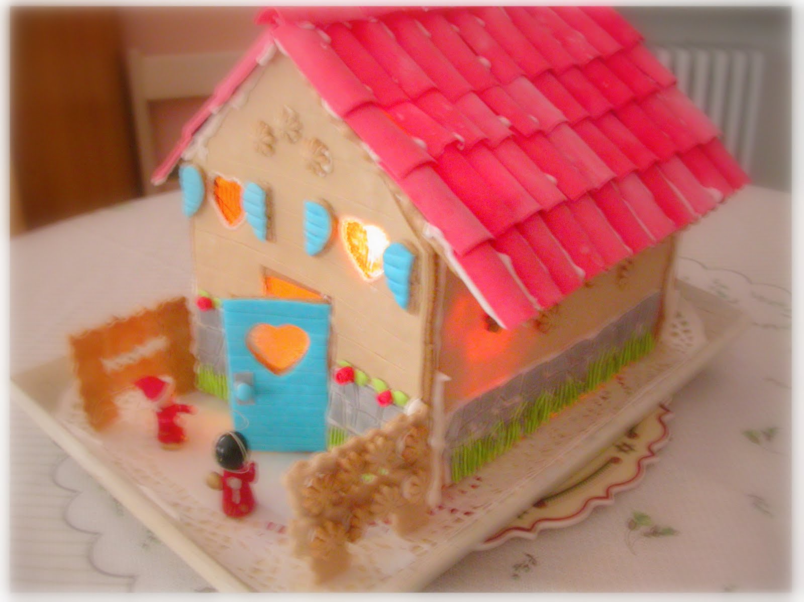 L'impasto della casetta è fatto con la pasta per i Biscotti Natalizi che trovate qui, le finestre sono state fatte con la tecnica dei biscotti di vetro il rivestimento è fatto con la pasta di zucchero di tanti colori, e l'assemblaggio è stato fatto con glassa reale....