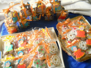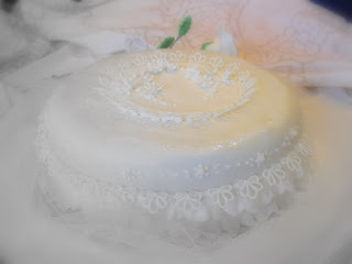 L'ispirazione l'ho presa dal blog "Non solo torte decorate...di Donatella", grande maestra in materia di ghiaccia reale, ovviamente i suoi lavori non hanno nulla a che vedere con i miei esperimenti, ma a parte la superficie della torta non perfettamente levigata devo ammettere che il risultato mi soddisfa......