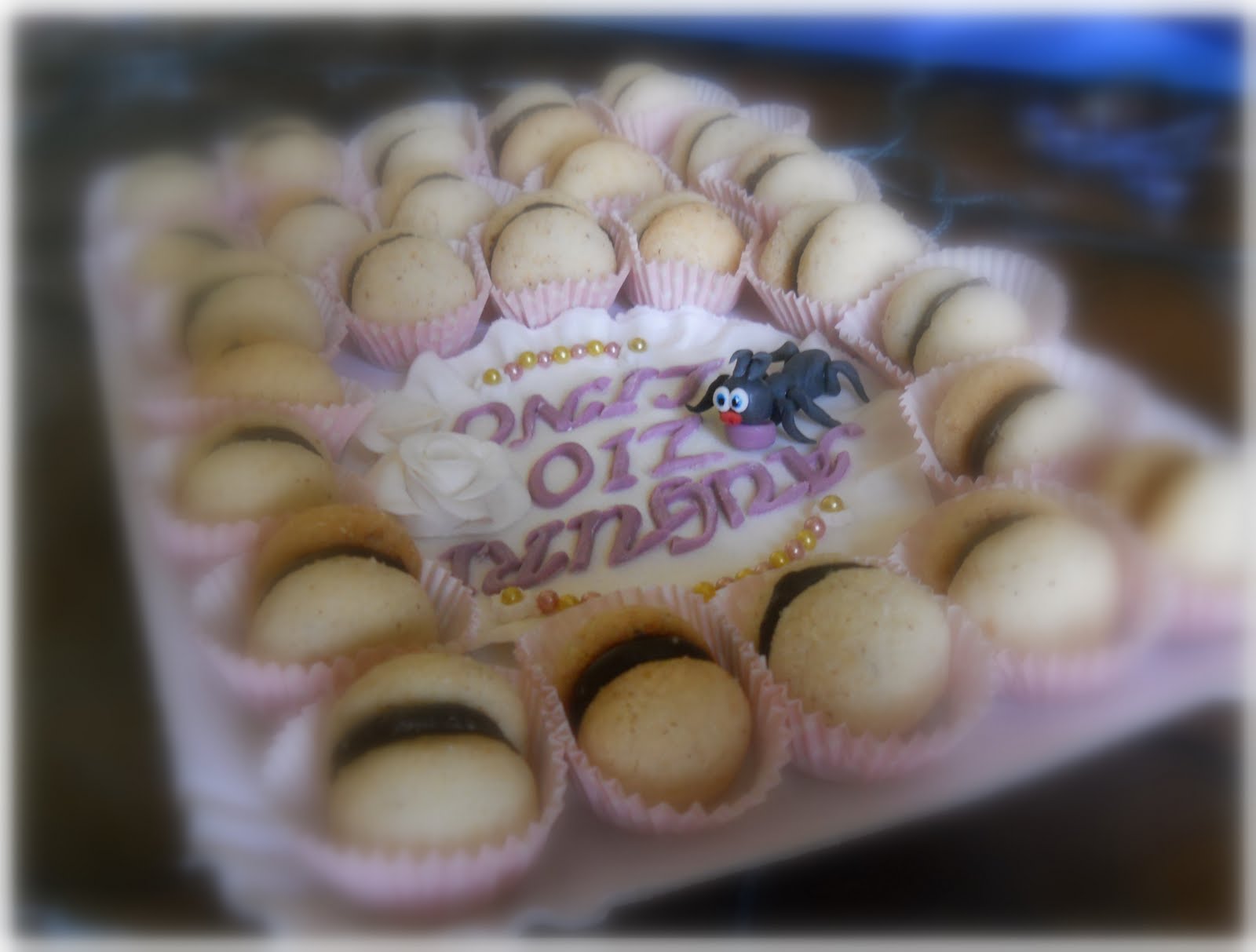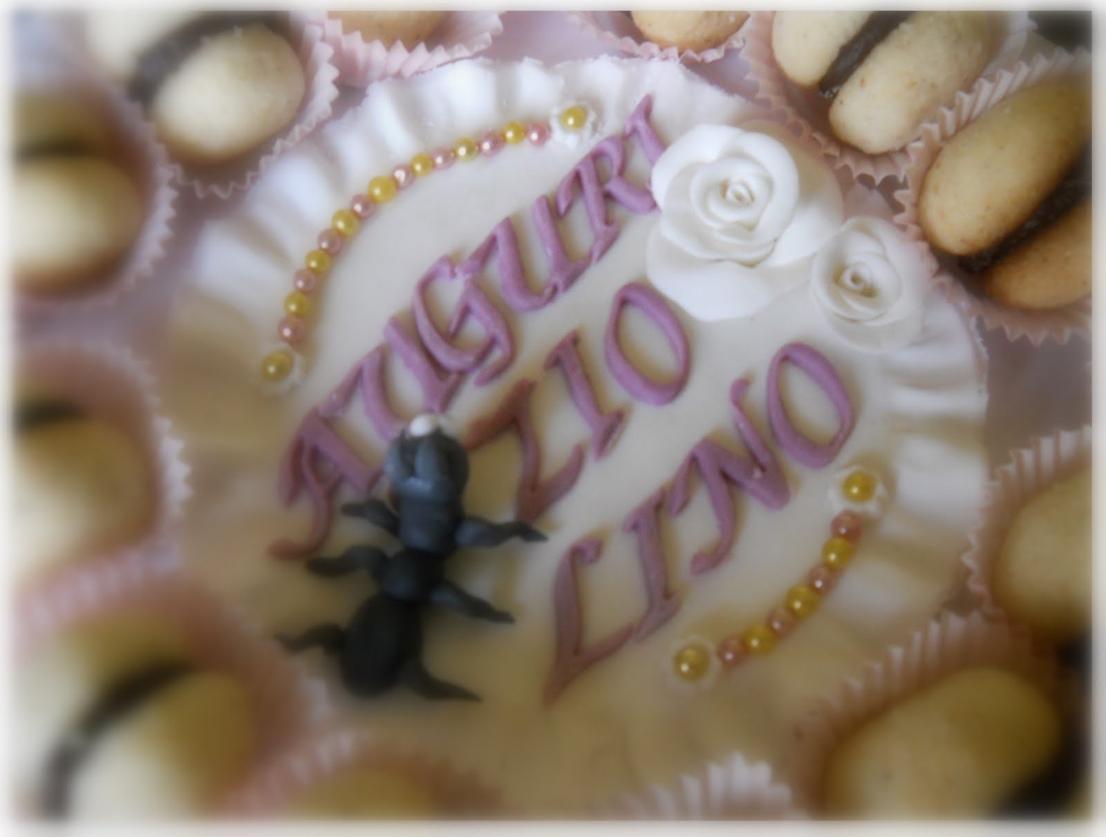 L'altro giorno ho preparato un piccolo topper in pasta di zucchero con una formichina e delle rose bianche sempre in pasta di zucchero il tutto contornato da baci di dama...spero che al festeggiato possa piacere.....