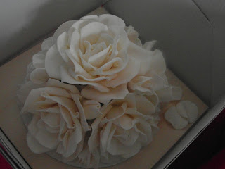 Ora vi lascio alle foto del mio ultimo lavoro...direi un Total White....la torta è stata ordinata in pasticceria, io mi sono occupata delle decorazioni, farfalle in Rojal Icing montate su fil di ferro (non vi dico quanto è stato difficile non romperle.....)...e tante tante tante rose bianche in gum paste, alcune per il topper, ed altre da posizionare sparse sui piani della torta....poi mi sono anche occupata delle scritte e del logo...ma questo è troppo personale e non lo posso postare.....;)